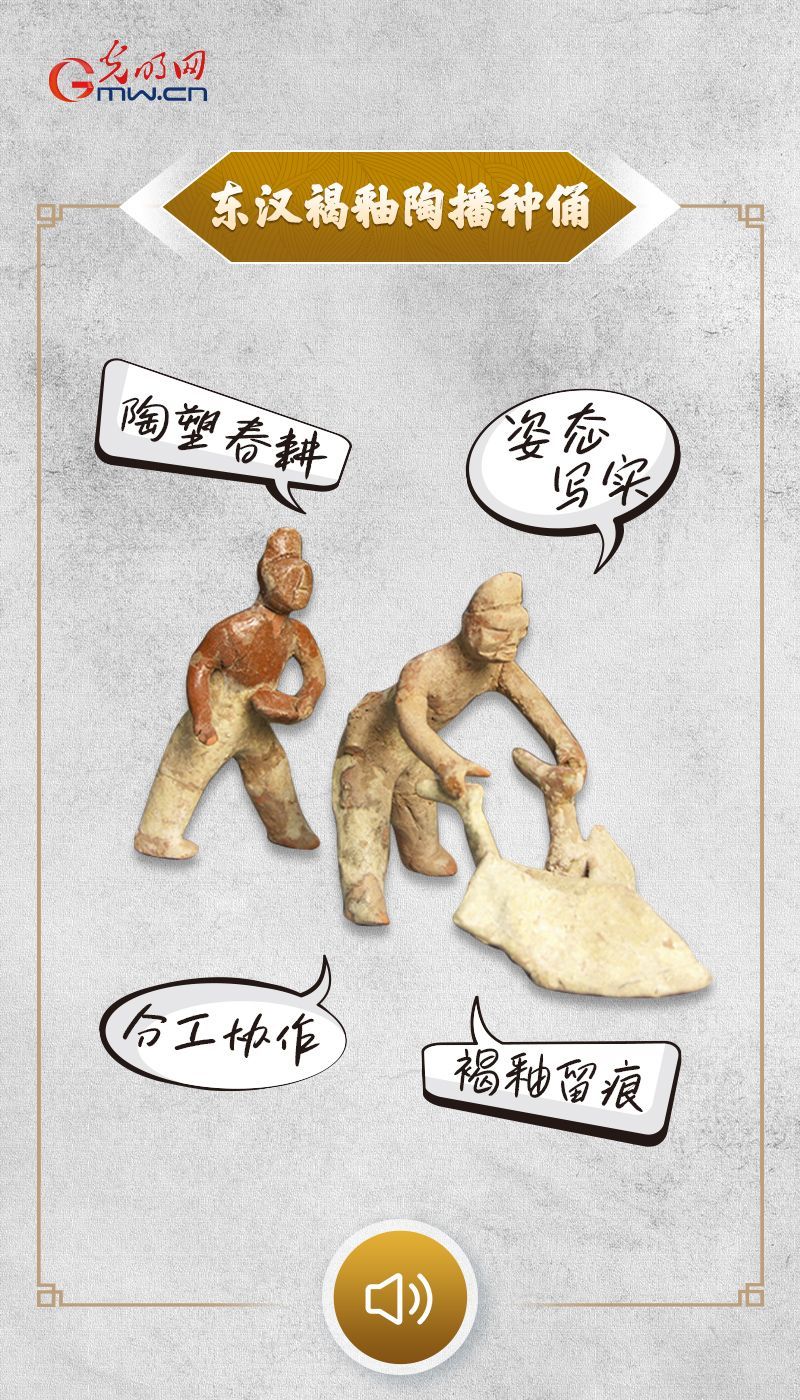 褐釉陶播种俑现藏于中国农业博物馆,东汉,高13厘米,陶俑造型为一人在前推犁,一人在后播撒种子,生动形象地还原了春耕时节,农人在田埂之间犁地、播种的场景。直观反映东汉时期的农耕技术、生产组织模式与社会对农业的重视,是研究汉代农业史、陶塑艺术的重要实物证据。