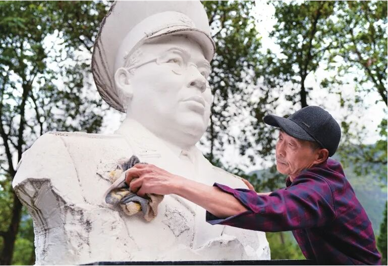 ▲4月3日,陈清国在擦拭黎化南将军雕像