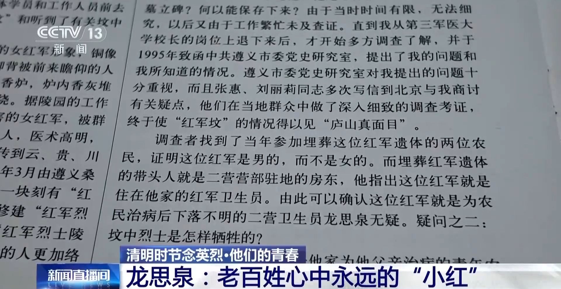直到1995年,时任第三军医大学校长的钟有煌来到遵义,听到“小红”的故事以后,钟校长回忆起长征期间,自己的部队有一名卫生员去给群众看病没有归队,经过他跟遵义党史部门一起多方核实,“小红”的真实身份就是龙思泉。