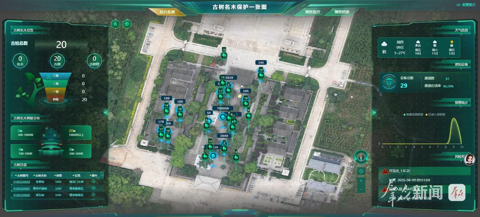 传统的人工巡查存在人力不足、时空有盲区、应急响应慢等痛点。如今,古树名木保护监管平台搭载2台超脑服务器,通过27路双光谱摄像头,配合AI识别算法实现实时预警,全域全时守护古柏安全。