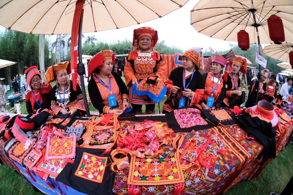 2024年4月11日,瑶族绣娘在广西南宁市“广西三月三·八桂嘉年华”青秀山主会场展示、售卖瑶绣。