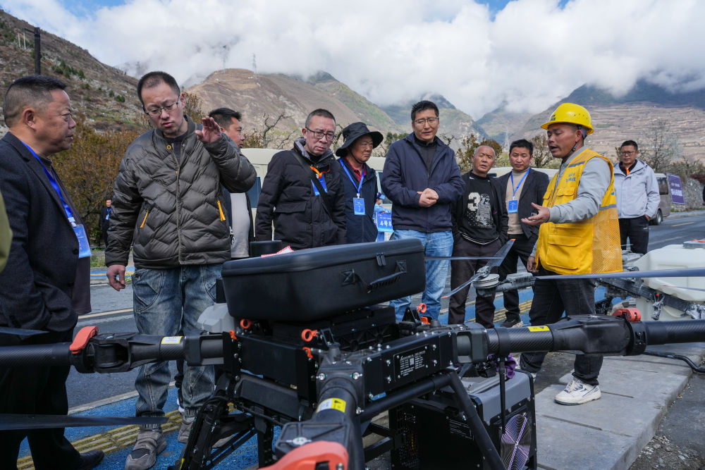 3月31日,在四川茂县“茂县李”标准化种植基地,2026“茂县李”产业发展大会参会专家和客商了解无人机植保情况。新华社记者王曦 摄