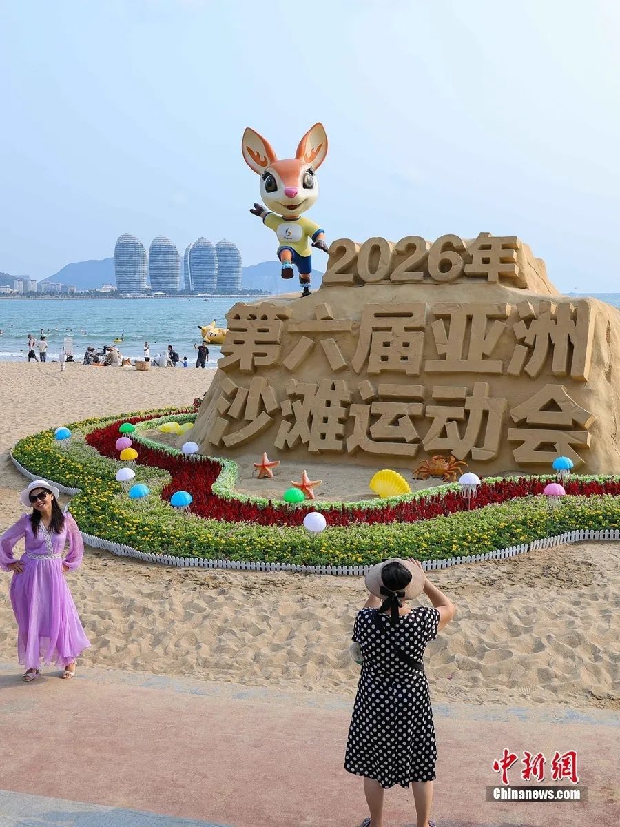 4月20日,第六届亚洲沙滩运动会的宣传标识与主题景观亮相三亚,吸引游客打卡拍照。骆云飞 摄
