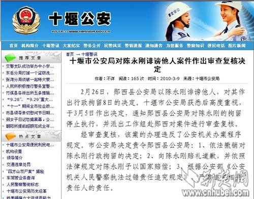 2月26日,郧西青年陈永刚因发帖举报当地领导搞形象工程,被县公安局以诽谤他人的名义,对其做出行政拘留8日的决定。十堰市公安局获悉后高度重视,于3月5日作出决定,通知郧西县公安局对陈永刚的拘留停止执行,并派出工作组赴郧西对案件进行审查复核。