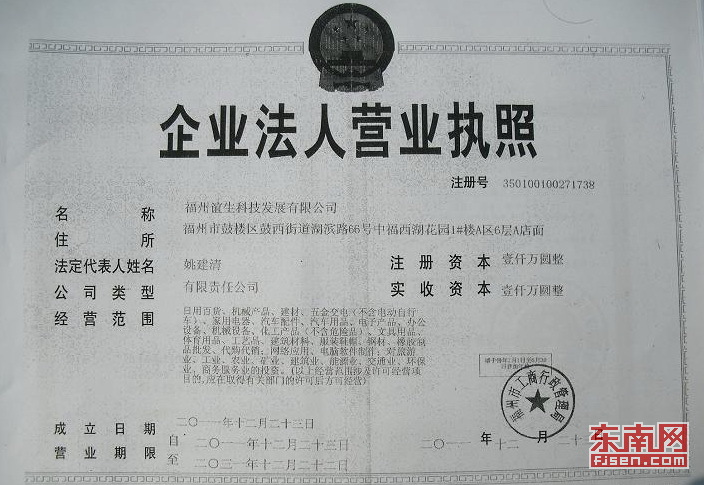 福州谊生科技发展有限公司的营业执照(网友提供)