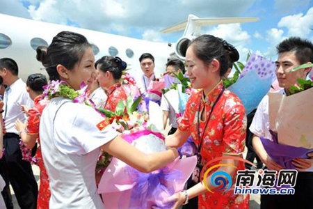 “6·29”反劫机英雄机组抵琼,在机场受到热烈欢迎。(海航供图)
