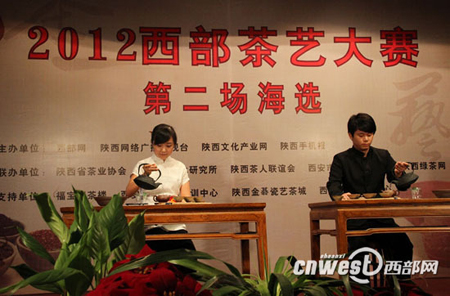 2012西部茶艺大赛第二场海选由中国茶叶流通协会副秘书长、陕西省茶叶协会副会长、陕西苍山茶业公司董事长纪晓明,陕西知名茶人、西安秀秀茶文化传播公司创始人陈秀琼和西安福宝阁茶楼艺术总监孙娟担任评委,十个参赛队分别有绿茶茶艺、乌龙茶艺、普洱茶艺、大红袍茶艺、长嘴铜壶茶艺等各种茶艺表演。其中德汇源茶道、夕夏茶文化以及歌风看燕茶厂等参赛选手颇受评委的好评。