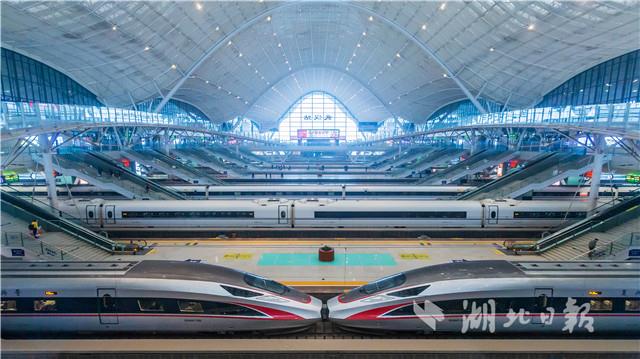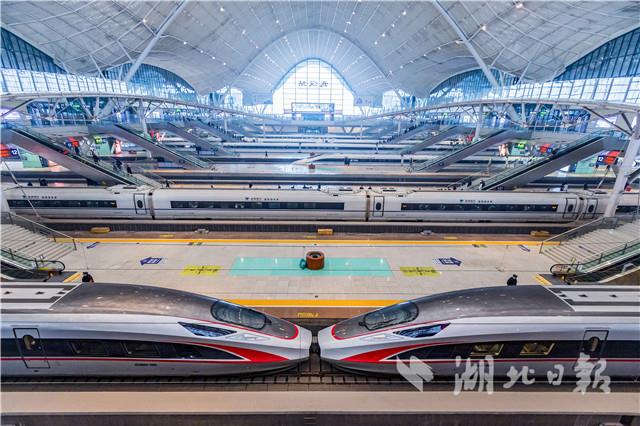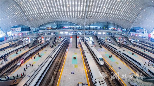- 1月5日,南来北往的高铁动车在武汉火车站各股道上载客运行。当日,全国铁路实施新的列车运行图,调图后,开行列车进一步加密,武汉火车站日最高开行旅客列车达473列,可直达全国26个省会城市。 (湖北日报全媒记者 梅涛 通讯员 钟明 摄)