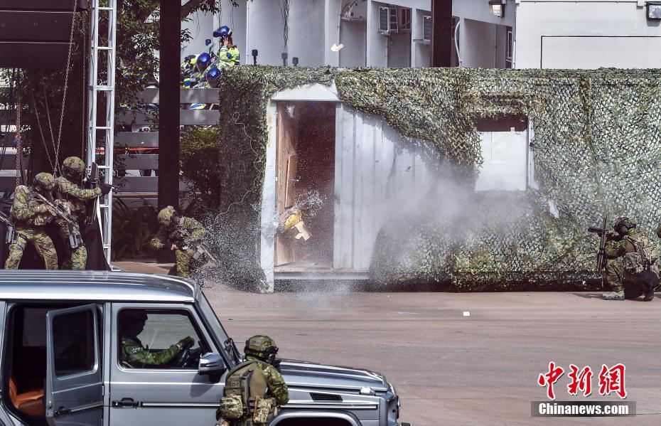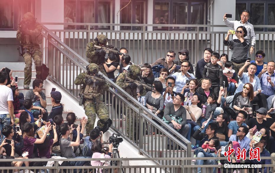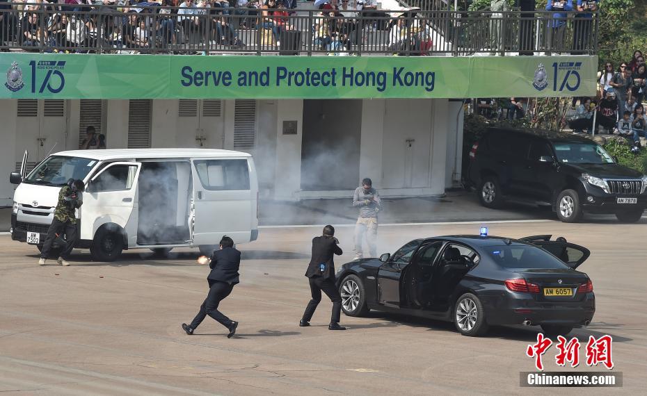 - 1月12日,“香港警队175周年大汇演暨警民同乐日“于黄竹坑香港警察学院举行,多个警队菁英部门,包括要员保护组、反恐特勤队及飞虎队等在汇演的联合反恐演习中亮相。演习模拟四名恐怖分子于香港进行袭击,警员乘坐直升机游绳而下,经过与恐怖分子驳火、爆破等演练后,最终成功逮捕犯人。中新社记者 麦尚旻 摄