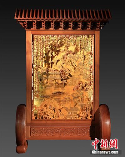 这是一件为复原“康乾盛世”时期中国宫殿宝座而打造的木雕。为了重现那种“皇家风范”,黄小明曾三次去看文物真品,而整件作品花了两年才完成。