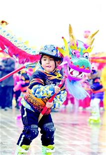 昨日,武汉市第25届迎春舞龙大赛暨第16届锣鼓比赛在汉口江滩三阳广场举行。图为小选手表演轮滑舞龙。楚天都市报记者萧颢摄