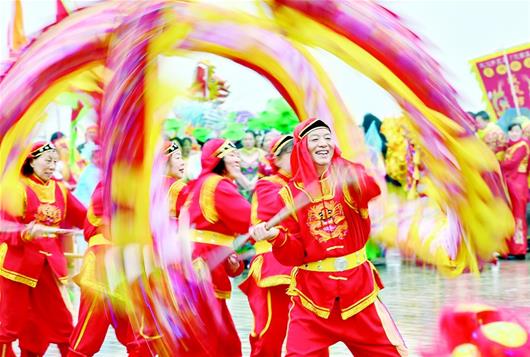 只见几名壮汉轮番登场,分别表演叩高龙、扫高龙、举高龙、抖高龙、顶高龙、托高龙等绝活,观众的喝彩声此起彼伏。