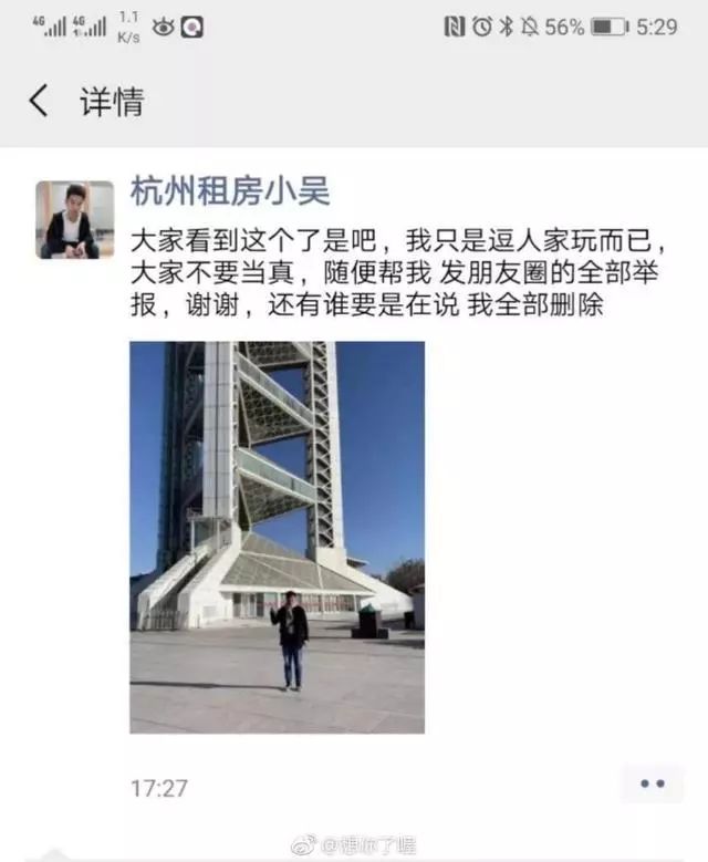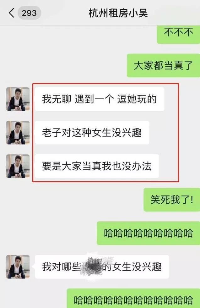 陈女士说,因为他们做租房行业,有顾客加微信都是通过的,但是一直有很多人会给小吴发和租房信息无关的内容,而且基本都是男性,之前一直没当回事。昨天下午,那名网友连续发了好几条骚扰微信,当时堂哥有点气愤,故意回怼了几句。“堂哥知道对方是男的,但言语确实不当,图片也是网上找来的,没有考虑后果,我也批评了他。”