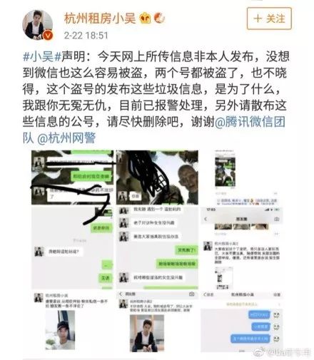 之后小吴也在自己的微博上发出声明称“网传信息非本人发布”,自称微信号被盗,并表示“已报警处理”,要求“散布这些信息的公号尽快删除”。小吴在这条微博中提到了@杭州网警。