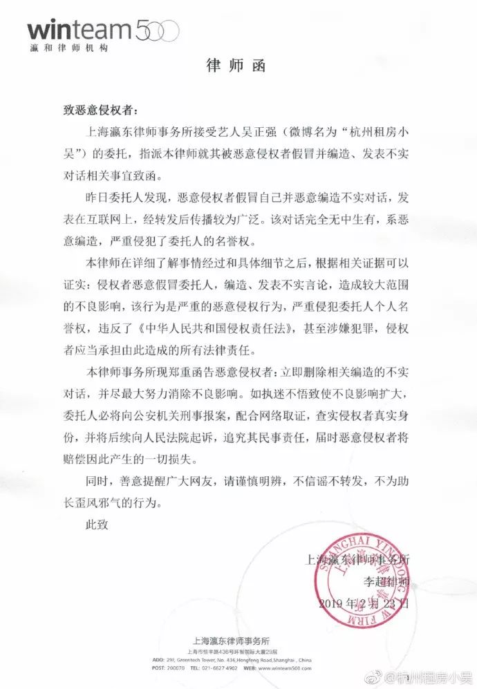 今天上午10点29分,小吴在自己的微博上发出了律师函,表示恶意侵权者假冒自己编造发布不实对话,望广大网友不信谣不传谣!