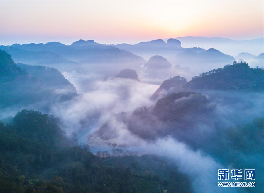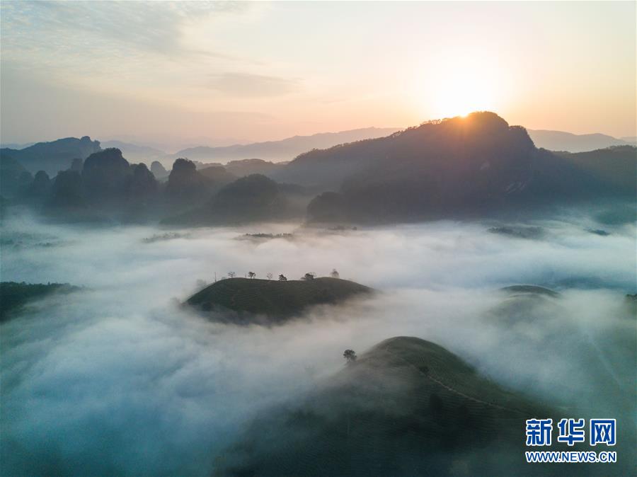 这是福建省武夷山风景名胜区的云海日出景观(3月12日无人机拍摄)。 近日,福建武夷山烟雨初歇、天气放晴、气温回升,青山绿水间时有云雾缭绕,宛若仙境。近年来,福建省武夷山市坚持生态优先,推进绿色发展,让“高颜值”山水释放出越来越多“生态红利”。 新华社记者 宋为伟 摄