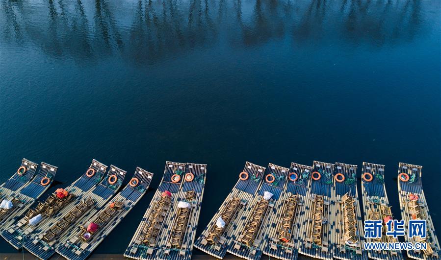 这是福建省武夷山风景名胜区九曲溪边停靠的竹筏(3月11日无人机拍摄)。 近日,福建武夷山烟雨初歇、天气放晴、气温回升,青山绿水间时有云雾缭绕,宛若仙境。近年来,福建省武夷山市坚持生态优先,推进绿色发展,让“高颜值”山水释放出越来越多“生态红利”。 新华社记者 宋为伟 摄