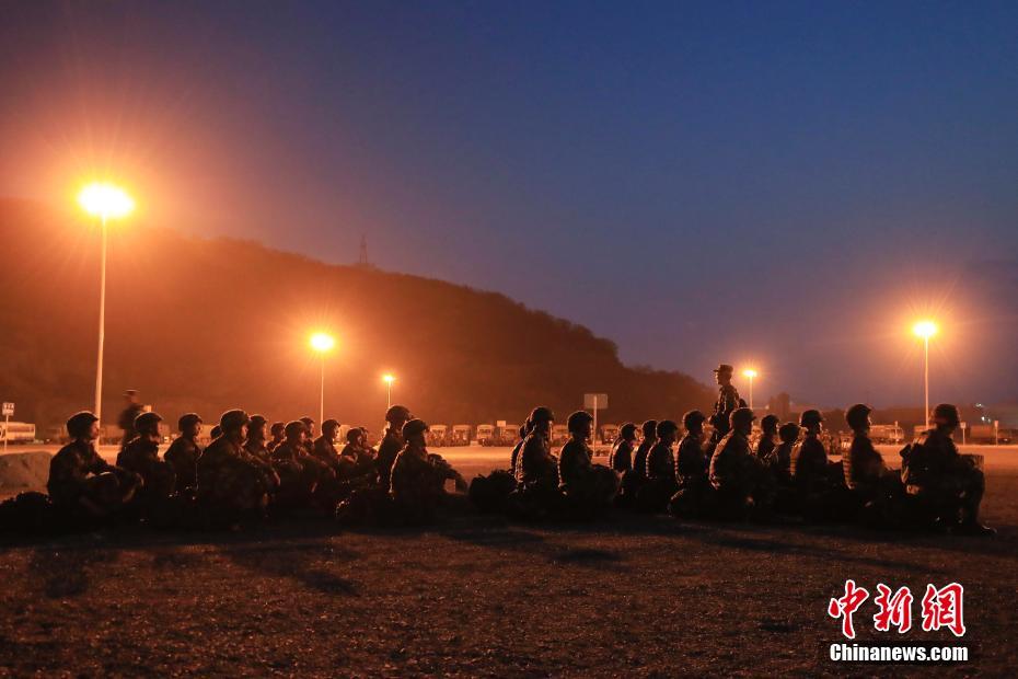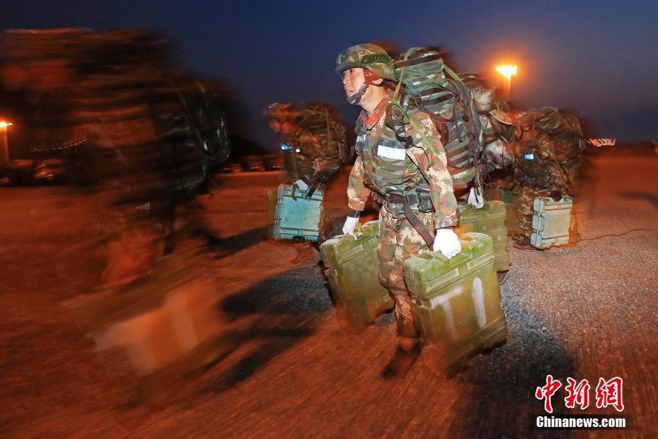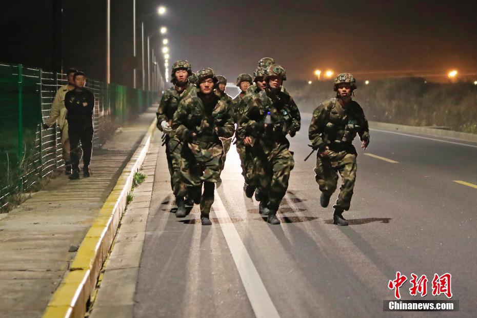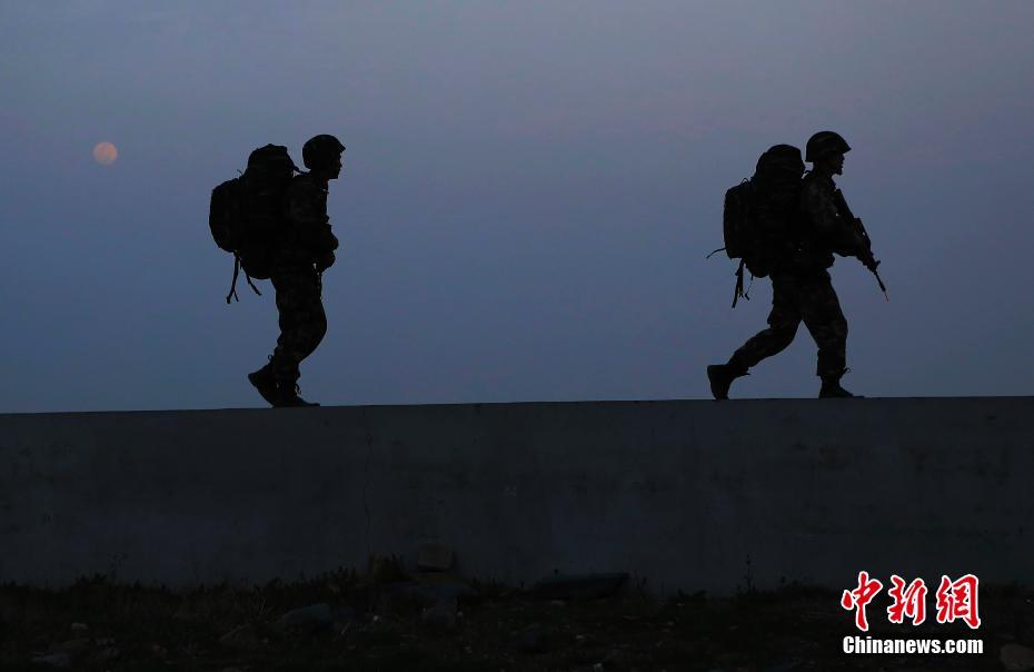 - 3月20日,武警上海总队执勤第二支队特战中队在洋山深水港某地开始了为期一周的“魔鬼周”极限训练。训练首日,特战队员们进行了长途行军、武装奔袭、极限爬行等7个课目的训练。图为特战队员在夜晚进行长途奔袭训练。 中新社记者 殷立勤 摄