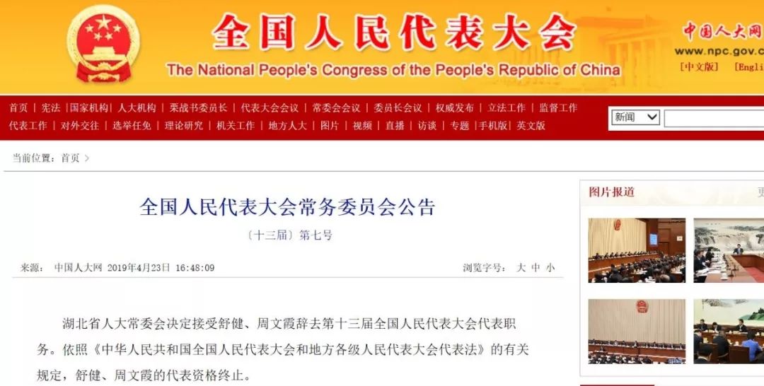 23日,十三届全国人大常委会代表资格审查委员会发布的关于个别代表的代表资格的报告显示:由湖北省选出的第十三届全国人民代表大会代表,湖北省文化旅游投资集团有限公司原副总经理、党委原委员周文霞,因个人原因,本人提出辞去第十三届全国人民代表大会代表职务。2019年3月29日,湖北省第十三届人大常委会第八次会议决定接受周文霞辞职。依照《中华人民共和国全国人民代表大会和地方各级人民代表大会代表法》的有关规定,周文霞的代表资格终止。