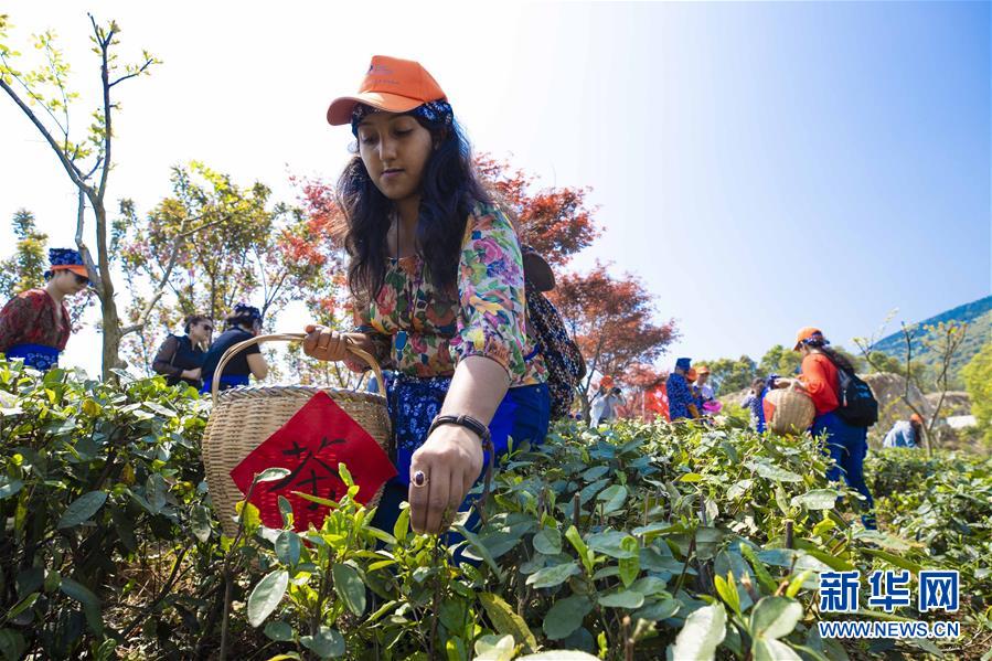 这是2019年4月8日拍摄的留学生在江西庐山一生态园体验采茶。 新华社发(韩俊烜 摄)