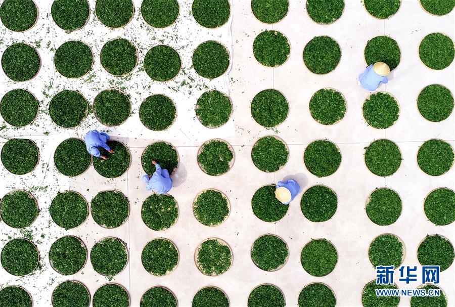 这是2019年4月15日无人机拍摄的工人在山东省郯城县晾晒用于炒制银杏茶的银杏叶。 新华社发(房德华 摄)
