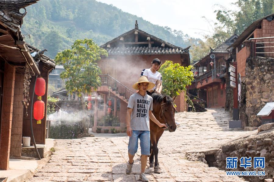 这是2019年4月14日拍摄的游客在那柯里村民小组体验骑马项目。那柯里位于云南省普洱市宁洱哈尼族彝族自治县同心镇,是古普洱府茶马古道上的一个重要驿站。