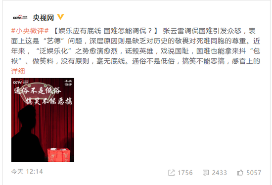 网易娱乐5月13日报道 5月13日中午,央视网发微博名为“娱乐应有底线,国难怎能调侃?”的短评评论张云雷事件,“张云雷调侃国难引发众怒,表面上这是“艺德”问题,深层原因则是缺乏对历史的敬畏对死难同胞的尊重。近年来,“泛娱乐化”之势愈演愈烈,诋毁英雄,戏说国耻,国难也能拿来抖“包袱”、做笑料,没有原则,毫无底线。通俗不是低俗,搞笑不能恶搞,感官上的刺激不代表精神上的快乐。这种娱乐的示范只会产生“愚乐”的结果,最终只会消解历史的意义,瓦解社会的价值底座。”