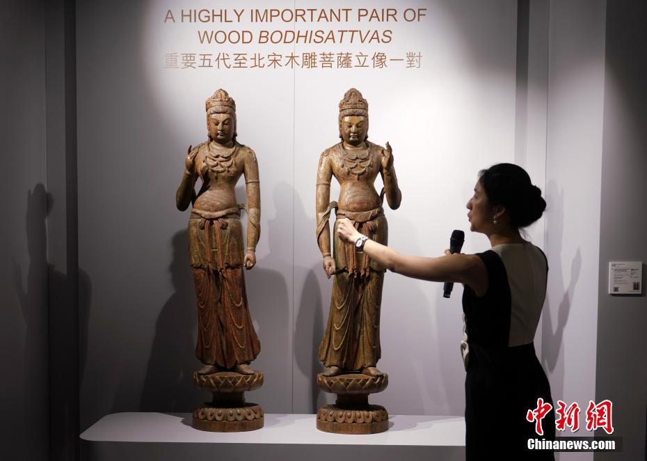 - 5月23日,一对罕见木雕菩萨立像在2019年佳士得香港春拍预展上亮相。该立像经放射性碳同位素定年法检测,确定为中国五代至北宋时期作品,造像真人大小,姿态娴雅,雕工精湛细致,形神兼备。该作品将于5月29日在佳士得香港春拍“梵华古韵”专场拍卖会上拍卖,估价4000万-6000万港元。中新社记者 张炜 摄