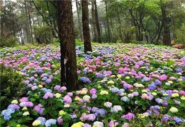 武汉市内也有一处观赏绣球花的打卡地,就在黄陂木兰花乡景区。幽静的树林下,数百万株彩色的绣球花团团相拥,生长在林深树密的山坡,花木结合形成了独特的赏花意境,吸引不少网红、情侣前往打卡。