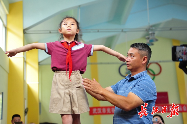 6月14日,由军运会体操项目竞赛委员会组织的“体操冠军光谷行”活动,走进光谷六小。李小双现场指导动作。记者彭年 摄