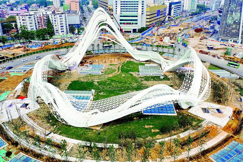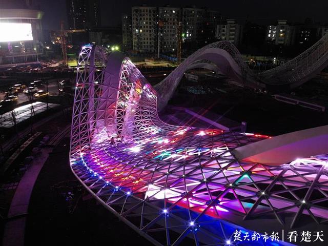 昨日上午9时,楚天都市报记者来到光谷广场。远远望去,广场上新完工的雕塑“星河”造型宛如一个巨型过山车,通身暖白色,有工人师傅正在雕塑上安装照明灯泡。该雕塑全部采用钢结构,最大高度40米,中心直径90米,总重量近1410吨,为国内最大单体钢结构雕塑。星河雕塑与地面共有六个连接点,分别置于地下结构空间的六根支柱上,与中心环岛的现状空间完美契合,塑造了光谷科技之光的都市形象。