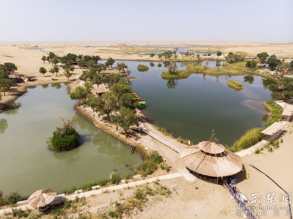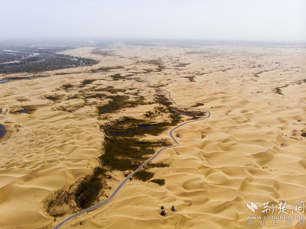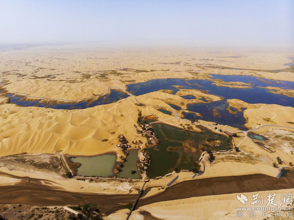 - 7月13日,“新疆是个好地方”全媒体采访团走进巴音郭楞蒙古自治州博湖县、尉犁县,一探两县在全域旅游上的发展成就。在此,采访团有幸感受了中国最大沙漠—塔克拉玛干沙漠的波澜壮阔,并在其中邂逅了神秘的罗布人。图为:鸟瞰塔克拉玛干沙漠,图中下方索桥跨过的即是中国第一大内陆河—塔里木河。(图文/荆楚网记者 刘建维 )