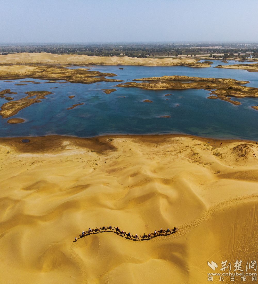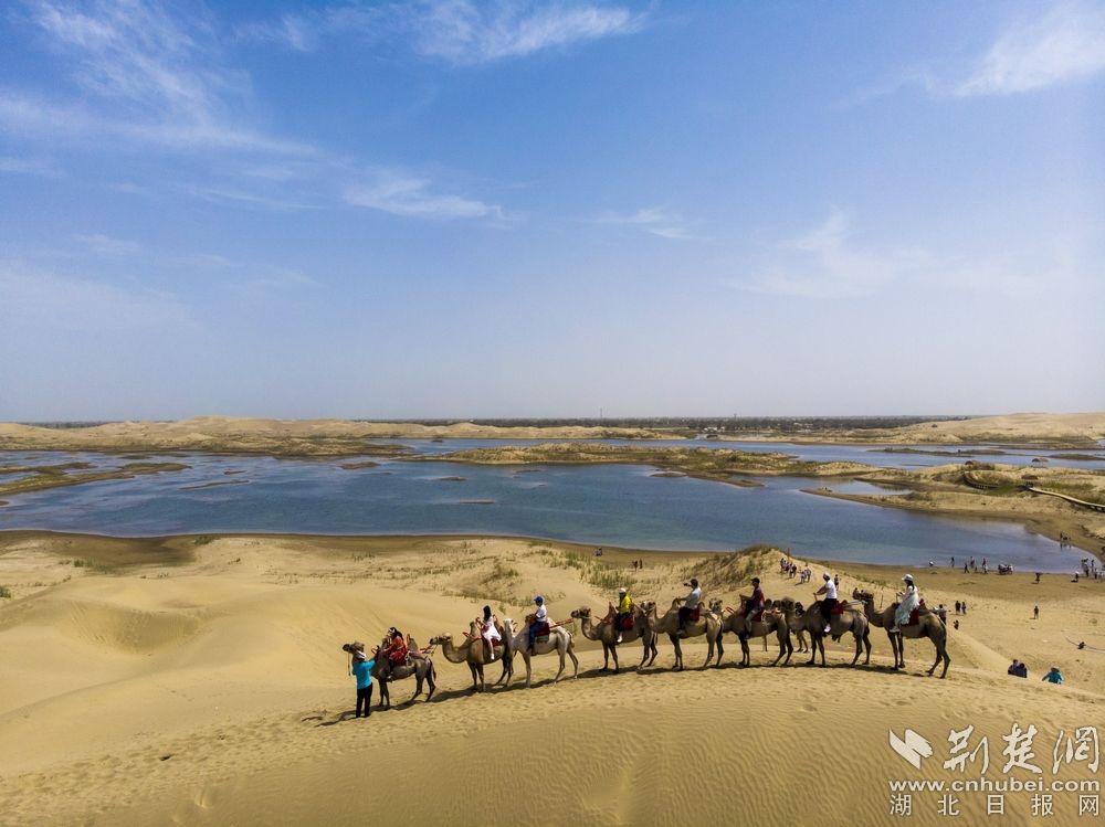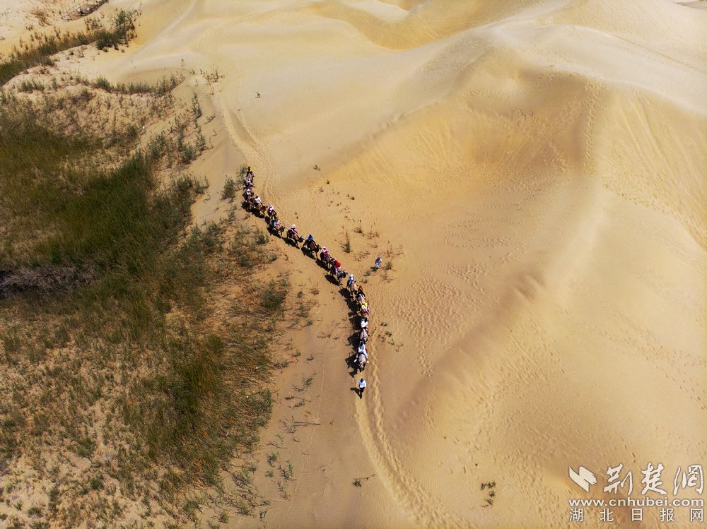 - 塔克拉玛干沙漠是中国最大的沙漠,也是世界第十大沙漠,同时亦是世界第二大流动沙漠。整个沙漠东西长约1000公里,南北宽约400公里,面积达33万平方公里。图为:游客正在尉犁县境内的塔克拉玛干沙漠中体验“沙漠之舟”—骆驼。记者刘建维 摄(无人机)