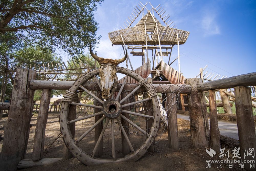 - 罗布人村寨位于尉犁县城西南35公里处,村寨方圆72平方公里。中国最大沙漠—塔克拉玛干沙漠、最长的内陆河—塔里木河、最大的原始胡杨林保护区和丝绸之路在这里交汇,形成了黄金品质的天然景观。图为:罗布人村寨图腾。记者刘建维 摄。