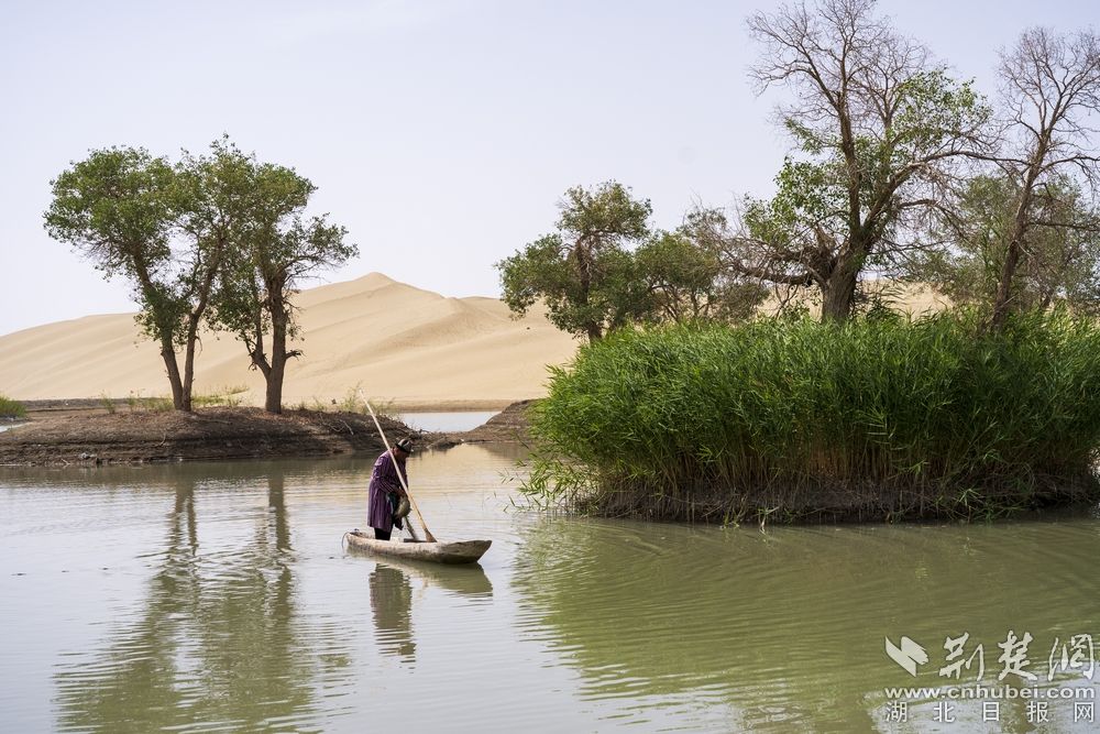 - 在沙漠中的海子并不是永久固定的,是会移动的,原因是在持续的风力作用下沙丘会移动,也会带动着海子移动。图为:在海子里打鱼狩猎的罗布人。
