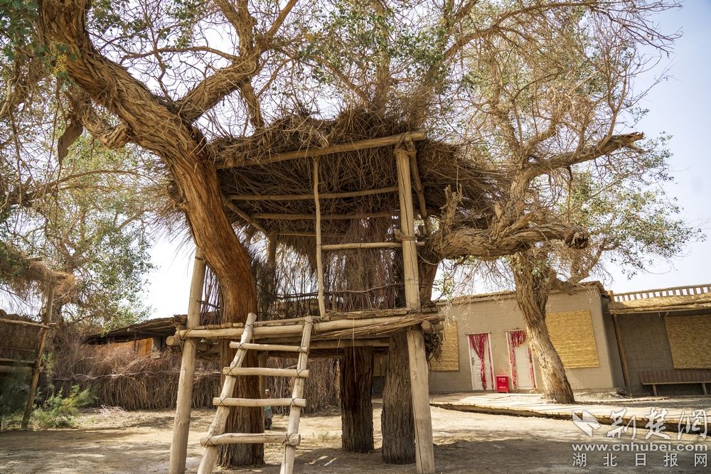 - 图为:罗布人传统房屋——树屋。记者 刘建维 摄。