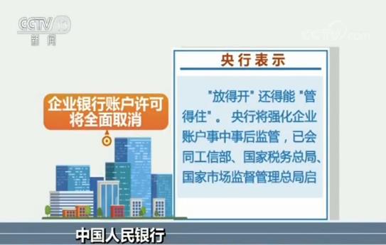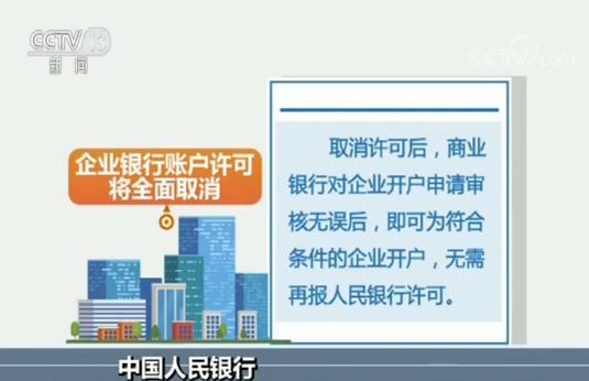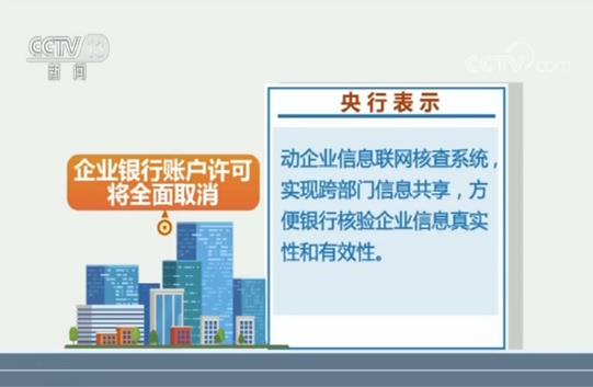 央视网消息:中国人民银行昨天(19日)宣布,将于本月22日,也就是下周一,全面取消企业银行账户许可,较此前国务院常务会议要求的时间提前五个多月。