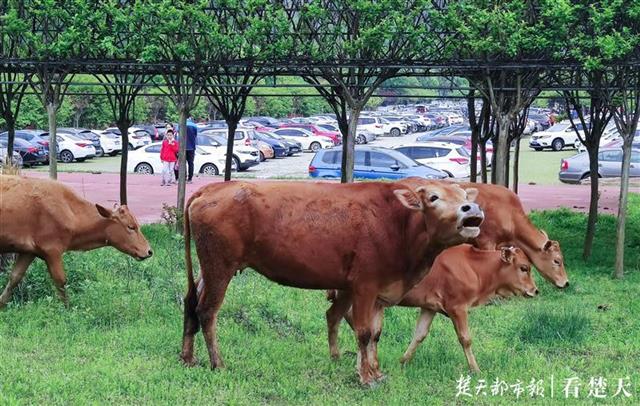 停车场旁边,一群黄牛也成景观
