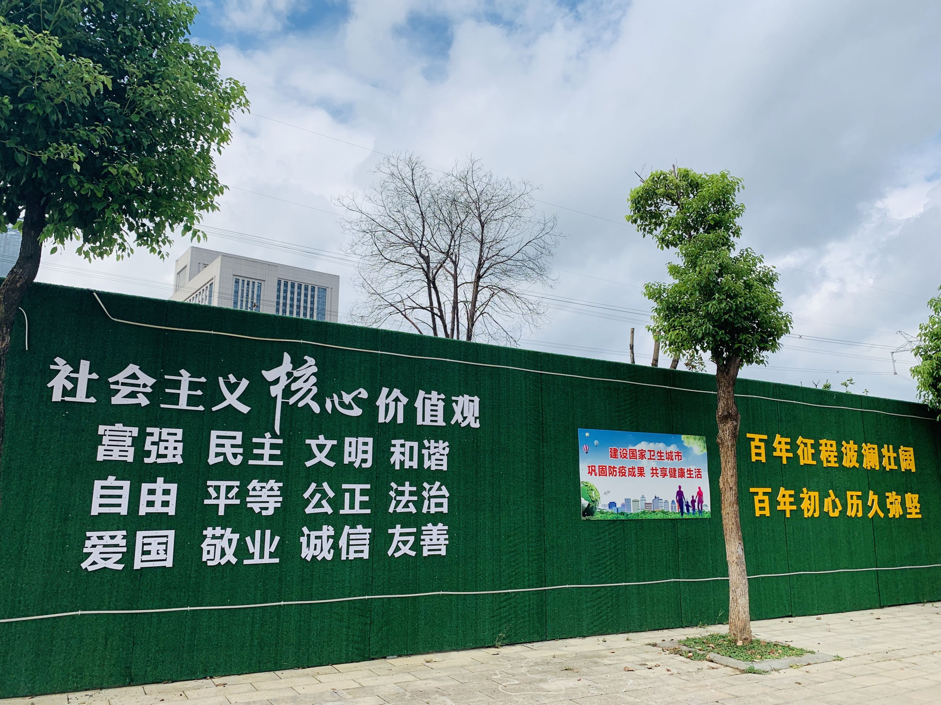 绿篱工地围挡设置公益广告。记者陶常宁 摄