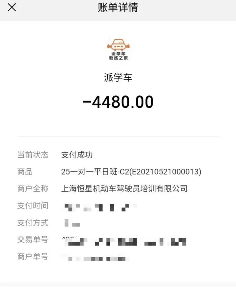 周女士在“派学车”平台为孩子报名了4480元的驾培课程,图为付款记录。