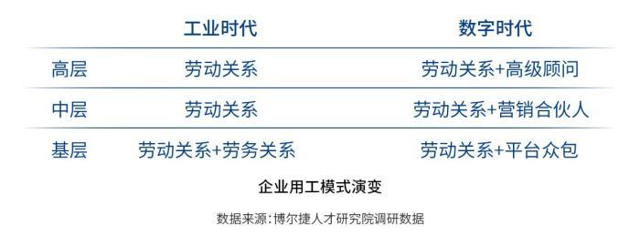 博尔捷人才研究院调查发现,数字时代企业用工模式相较于工业时代发生了明显变化,例如,企业高层人员中除了CXO外往往出现资深的战略顾问、营销顾问、税务法务顾问等,中层业务相关人员则出现除了自有员工,还有社会化的营销合伙人的现象,甚至营销合伙人人员占比高达五成,同时,可贡献与企业自有业务团队相当的业绩。