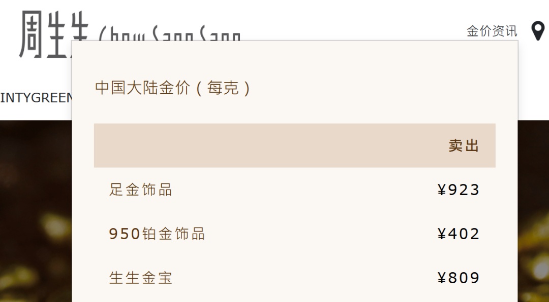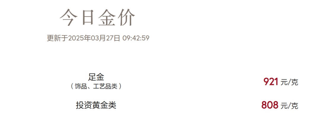 3月27日,周生生足金饰品标价已达923元/克,周大福足金饰品标价921元/克。
