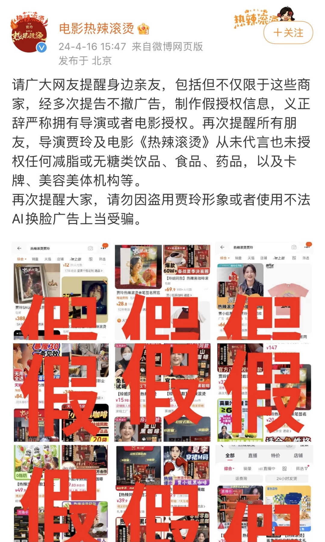 今年4月16日,电影热辣滚烫官方微博发出了多张打假图片,图片中不乏贾玲同款《热辣滚烫》短袖、贾玲同款减肥黑咖啡等产品。电影方声称,导演贾玲及电影《热辣滚烫》从未代言也未授权任何减脂或无糖类饮品、食品、药品,以及卡牌、美容美体机构等,提醒网友不要上当受骗。