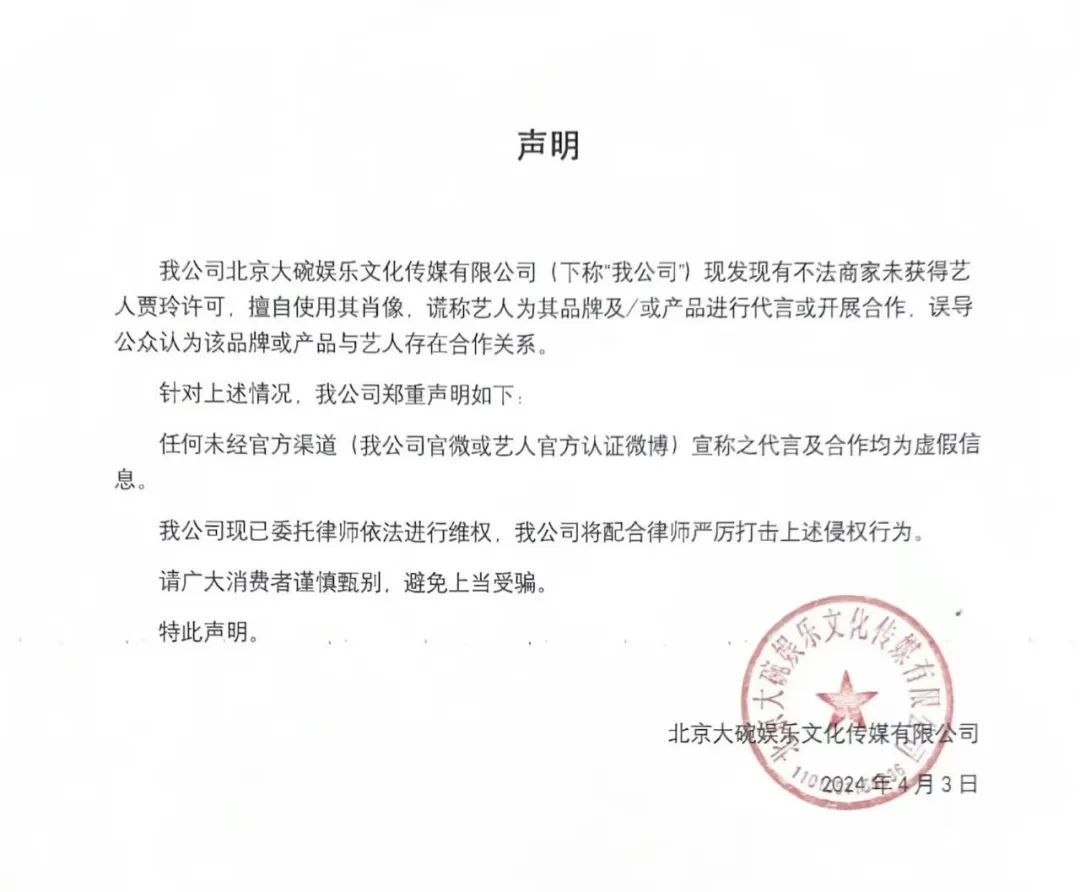 今年4月,北京大碗娱乐文化传媒有限公司发布声明称,现发现有不法商家未获得艺人贾玲许可,擅自使用其肖像,谎称艺人为其品牌或产品进行代言或开展合作,误导公众认为该品牌或产品与艺人存在合作关系,针对上述情况,公司郑重声明:任何未经官方渠道宣称之代言及合作均为虚假信息,公司已委托律师依法进行维权。请广大消费者谨慎甄别,避免上当受骗。
