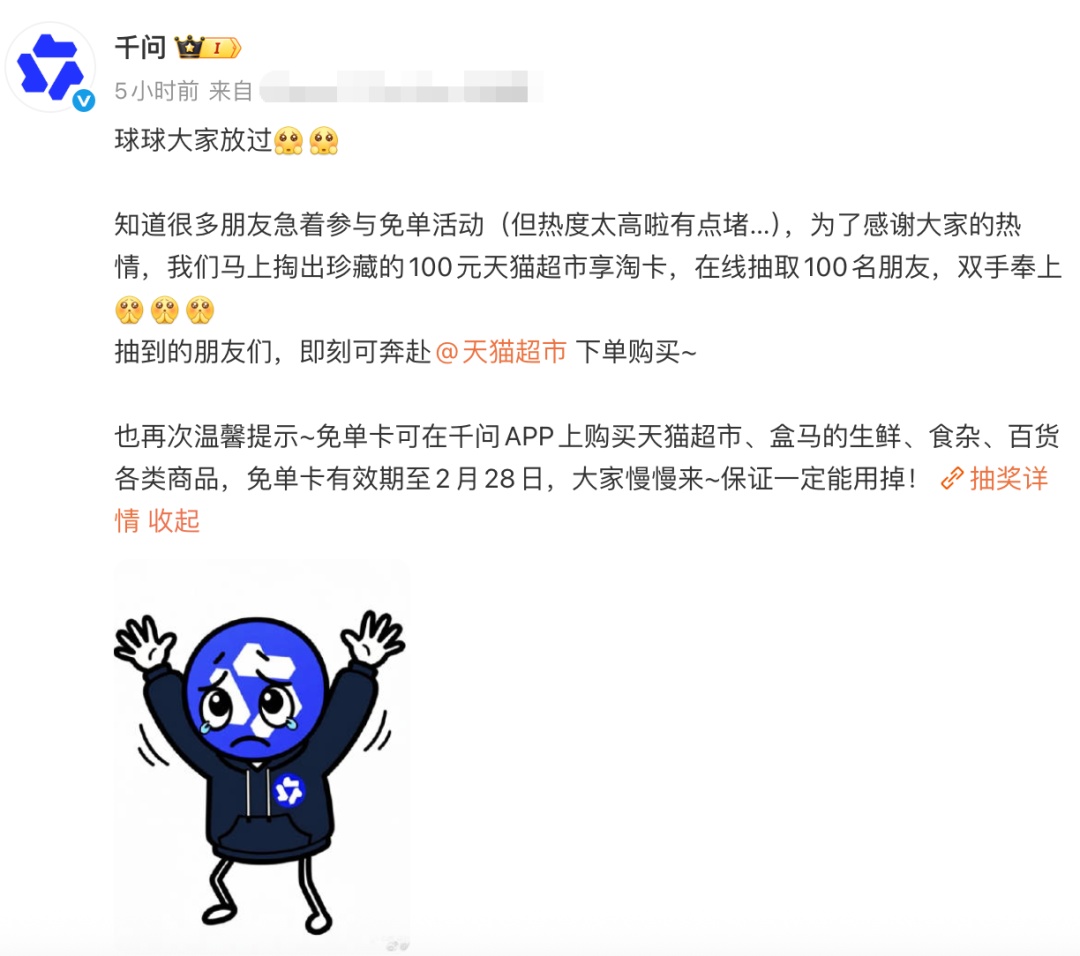 今天下午,千问发文称“球球大家放过”,知道很多朋友急着参与免单活动,但热度太高有点堵。千问再次提醒免单卡有效期至2月28日,“大家慢慢来,保证一定能用掉!”