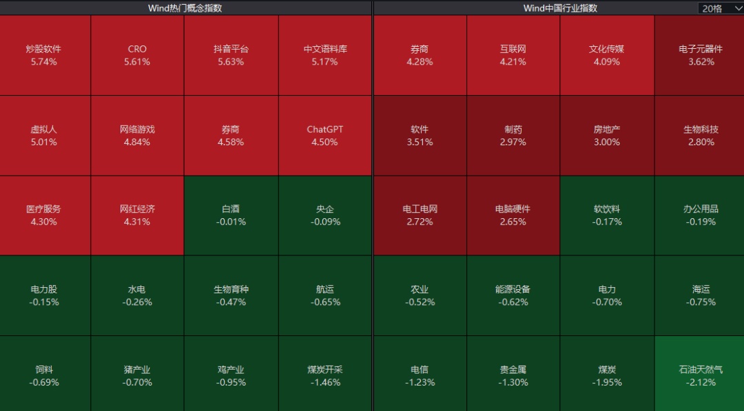 在短剧热度的影响下,AI应用方向再度走高,文化传媒、网络游戏、虚拟人等概念多股涨停,房地产、医药、消费电子等表现活跃;而能源股持续下跌,农业、水电、白酒板块跌幅居前。总体上涨多跌少,超4500家个股上涨。