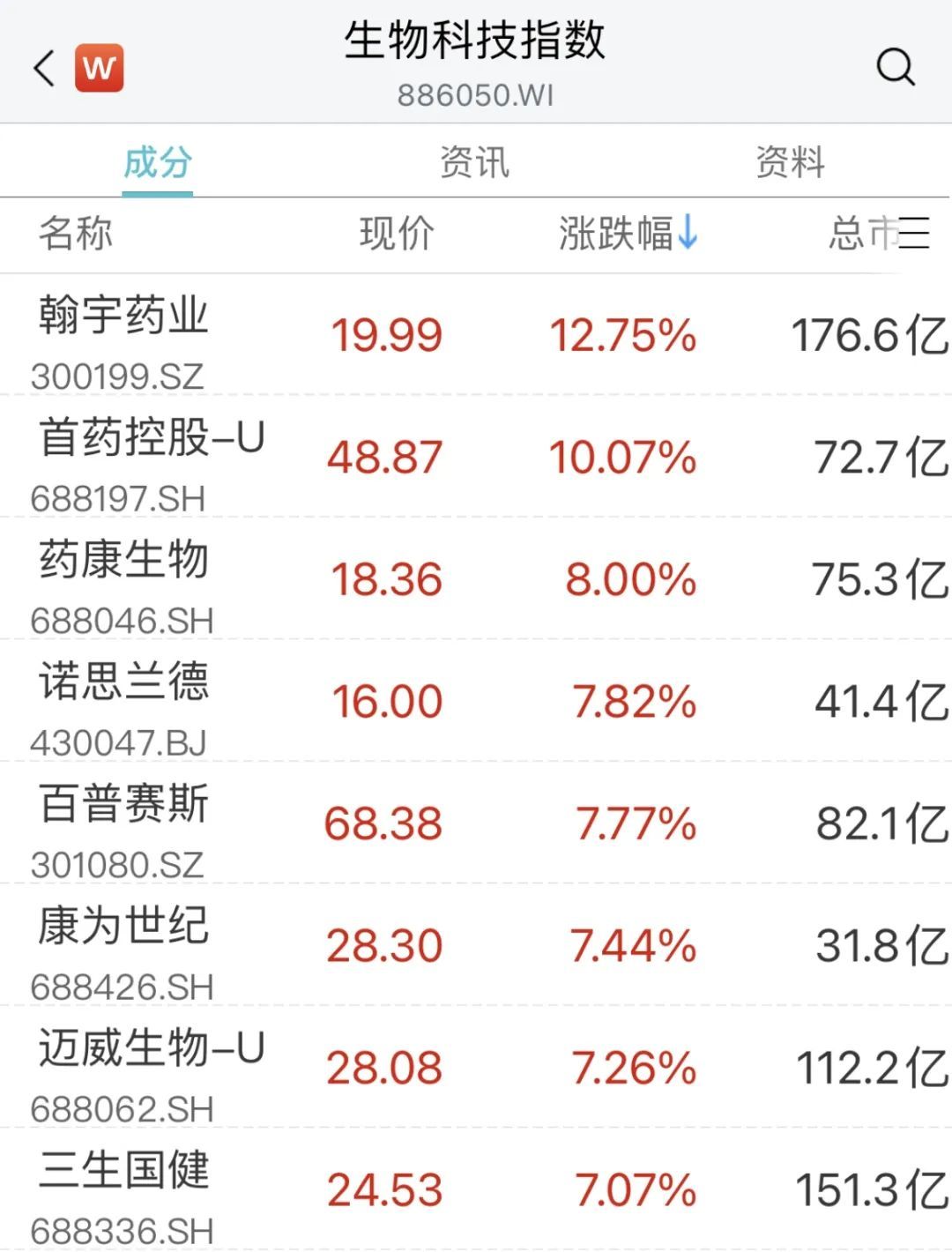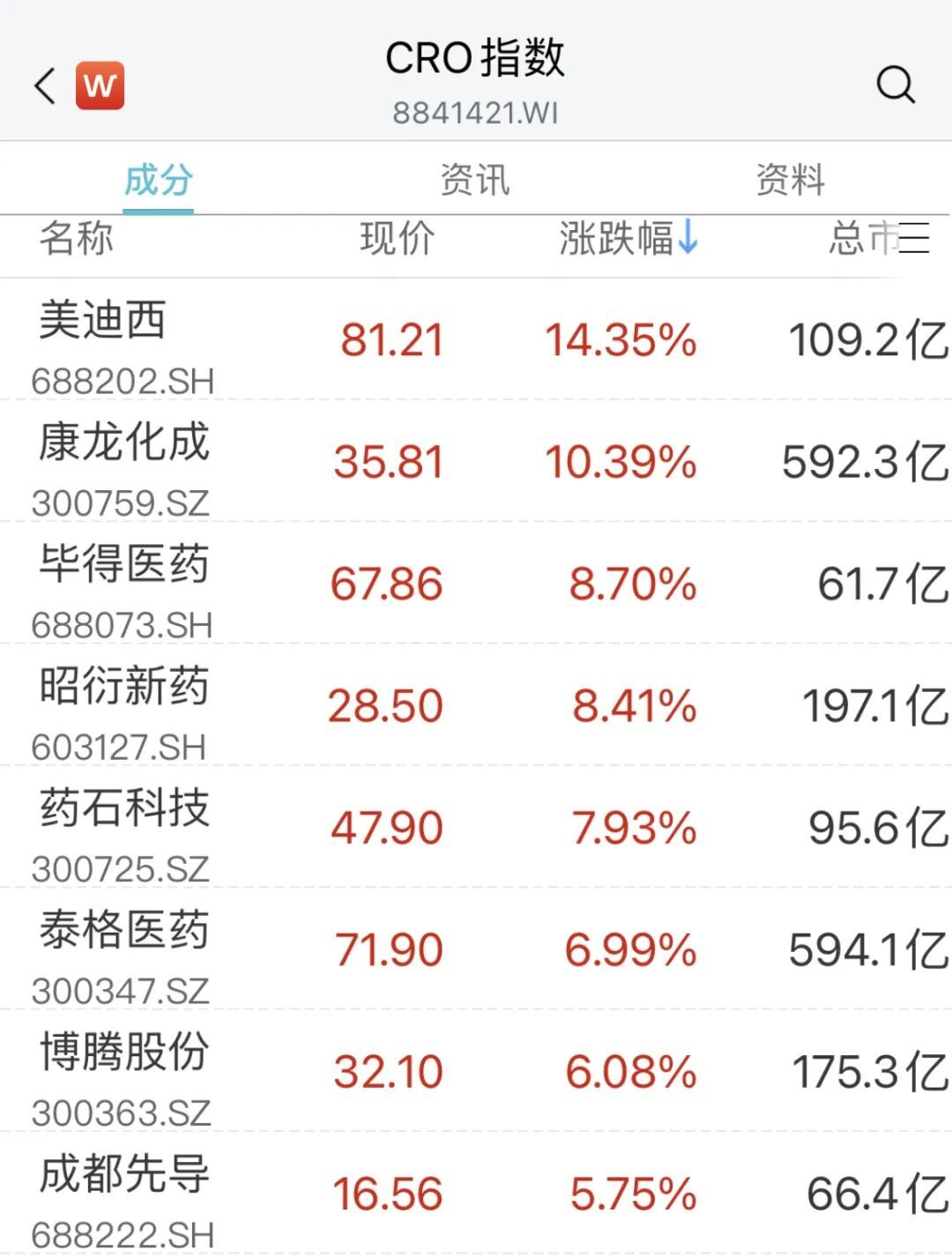 医药股涨势如潮,CRO概念股快速走强,美迪西、康龙化成涨超10%,毕得医药、药石科技、泰格医药等跟涨。