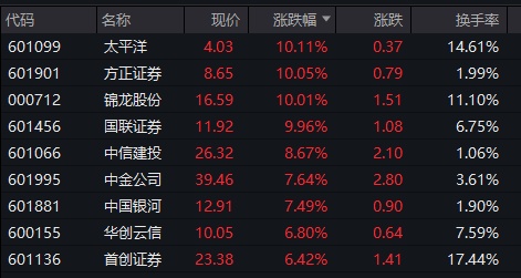 板块上,作为“牛市旗手”的券商股开盘大涨,太平洋、方正证券、锦龙股份、国联证券等纷纷涨停。