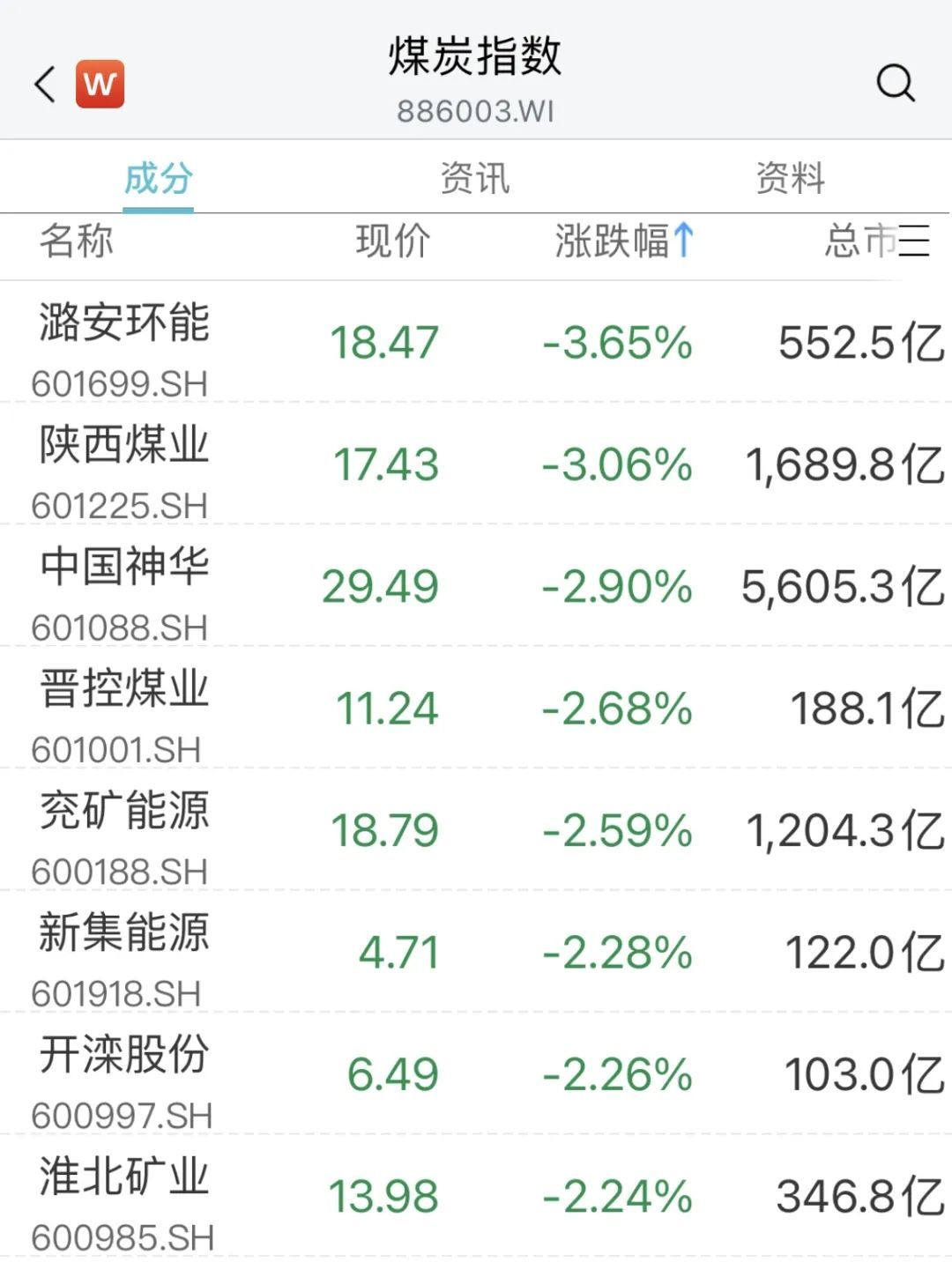 煤炭股单边下挫,潞安环能跌超3%,陕西煤业、中国神华、兖矿能源等跟跌。