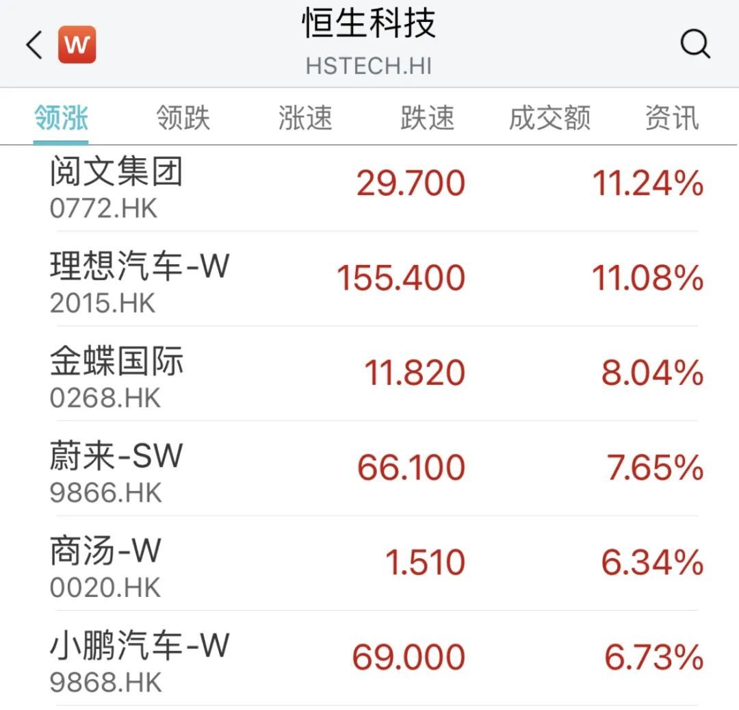 港股方面,三大指数悉数上涨,恒生科技指数一度大涨超4%,造车新势力领涨,理想汽车涨超11%,蔚来、小鹏汽车涨超6%。